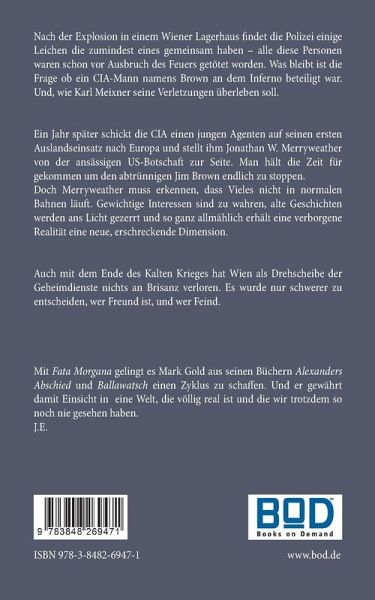 Nach der Explosion in einem Wiener Lagerhaus findet die Polizei einige Leichen die zumindest eines gemeinsam haben - alle diese Personen waren schon vor Ausbruch des Feuers getötet worden. Was bleibt ist die Frage ob ein CIA-Mann namens Brown an dem Inferno beteiligt war. Und, wie Karl Meixner seine Verletzungen überleben soll.Ein Jahr später schickt die CIA einen jungen Agenten auf seinen ersten Auslandseinsatz nach Europa und stellt ihm Jonathan W. Merryweather von der ansässigen US-Botschaft zur Seite. Man hält die Zeit für gekommen um den abtrünnigen Jim Brown endlich zu stoppen.Doch Merryweather muss erkennen, dass Vieles nicht in normalen Bahnen läuft. Gewichtige Interessen sind zu wahren, alte Geschichten werden ans Licht gezerrt und so ganz allmählich erhält eine verborgene Realität eine neue, erschreckende Dimension.Auch mit dem Ende des Kalten Krieges hat Wien als Drehscheibe der Geheimdienste nichts an Brisanz verloren. Es wurde nur schwerer zu entscheiden, wer Freund ist, und wer Feind.Mit Fata Morgana gelingt es Mark Gold aus seinen Büchern Alexanders Abschied und Ballawatsch einen Zyklus zu schaffen. Und er gewährt damit Einsicht in eine Welt, die völlig real ist und die wir trotzdem so noch nie gesehen haben.J.E.
