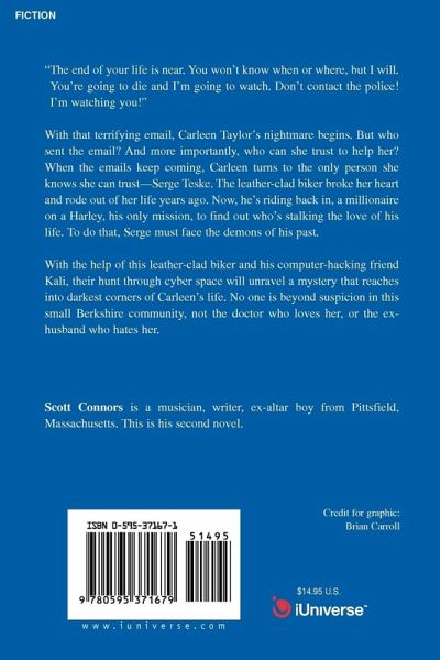 'The end of your life is near. You won't know when or where, but I will. You're going to die and I'm going to watch. Don't contact the police! I'm watching you!" With that terrifying email, Carleen Taylor's nightmare begins. But who sent the email? And more importantly, who can she trust to help her? When the emails keep coming, Carleen turns to the only person she knows she can trust-Serge Teske. The leather-clad biker broke her heart and rode out of her life years ago. Now, he's riding back in, a millionaire on a Harley, his only mission, to find out who's stalking the love of his life. To do that, Serge must face the demons of his past. With the help of this leather-clad biker and his computer-hacking friend Kali, their hunt through cyber space will unravel a mystery that reaches into darkest corners of Carleen's life. No one is beyond suspicion in this small Berkshire community, not the doctor who loves her, or the ex-husband who hates her.