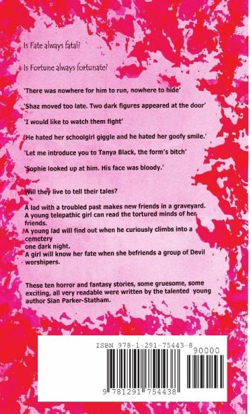 Is Fate always fatal? Is Fortune always fortunate? Fatal Fortune is a collection of spine chilling short stories. These teen horror and fantasy stories, some gruesome, some exciting, all very readable were written by the talented young author Sian Parker-Statham. 'There was nowhere for him to run, nowhere to hide', 'Shaz moved too late. Two dark figures appeared at the door' 'I would like to watch them fight' 'He hated her schoolgirl giggle and he hated her goofy smile' 'Let me introduce you to Tanya Black, the form's bitch' 'Sophie looked up at him, his face was bloody' Will they live to tell their tales? A lad with a troubled past makes new friends in a graveyard. A young telepathic girl can read the tortured minds of her friends. A young lad will find out when he curiously climbs into cemetery one dark night A girl will know her fate when she befriends a group of devil worshipers!