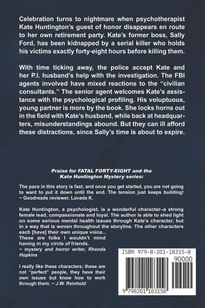 Celebration turns to nightmare when psychotherapist Kate Huntington's guest of honor disappears en route to her own retirement party. Kate's former boss, Sally Ford, has been kidnapped by a serial killer who holds his victims exactly forty-eight hours before killing them. With time ticking away, the police allow Kate and her P.I. husband to help with the investigation. The FBI agents involved in the case have mixed reactions to the "civilian consultants." The senior agent welcomes Kate's assistance as he fine-tunes his psychological profile. His voluptuous, young partner is more by the book. While she locks horns out in the field with Kate's husband, misunderstandings abound back at headquarters. But they can ill afford these distractions. They have to find Sally, before her time expires. (This book is part of a series but is designed to be read and enjoyed as a stand-alone novel.)
