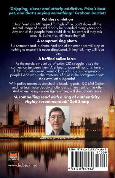 RUTHLESS AMBITION Hugh Ventham MP, tipped for high office, can't shake off the mental image of a sordid party he attended many years ago. Any one of the people there could derail his career if they talk about it. So he must eliminate them all. A COMPROMISING PHOTO But someone took a photo. And one of the attendees will stop at nothing to ensure it is never discovered. If they fail, they will face ruin. A BAFFLED POLICE FORCE As the murders mount up, Mexton CID struggle to see the connection between them. Are they random killings or is there a link? If so, who would want to kill such a disparate group of people? And who is the mysterious figure in the background with their own lethal agenda? With police resources stretched to breaking point, DC Mel Cotton and her team face deadly challenges as they hunt for the killer. And when the mysterious figure strikes, will she get out alive?