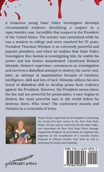 A tenacious young State Police Investigator develops circumstantial evidence identifying a suspect in a rape/murder case. Incredibly that suspect is the President of the United States. The murder was committed while he was a student in college and went unsolved for 25 years. President Thurston Winslow is an extremely powerful and popular president, and when he realizes that State Police Investigator Ron Keston is investigating him, wields his power and has Keston assassinated. Lieutenant Richard Miranda, Keston's supervisor, commences an investigation and survives a diabolical attempt to destroy his career and, later, an attempt at assassination because of intuition, intelligence, skill and lots of luck. Miranda utilizes his own brand of diabolical skill to develop prima facie evidence against the President. However, the President seems above the law and too powerful for prosecution. A race begins to destroy the most powerful man in the world before he destroys them. Who wins? The excitement mounts and climaxes in a crescendo of irony.