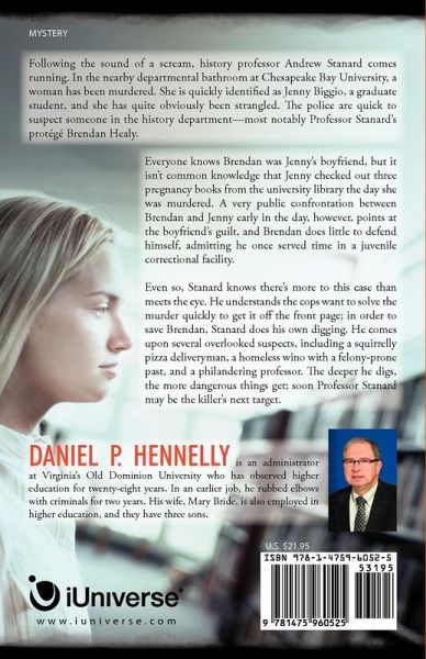 Following the sound of a scream, history professor Andrew Stanard comes running. In the nearby departmental bathroom at Chesapeake Bay University, a woman has been murdered. She is quickly identified as Jenny Biggio, a graduate student, and she has quite obviously been strangled. The police are quick to suspect someone in the history department-most notably Professor Stanard's protégé Brendan Healy. Everyone knows Brendan was Jenny's boyfriend, but it isn't common knowledge that Jenny checked out three pregnancy books from the university library the day she was murdered. A very public confrontation between Brendan and Jenny early in the day, however, points at the boyfriend's guilt, and Brendan does little to defend himself, admitting he once served time in a juvenile correctional facility. Even so, Stanard knows there's more to this case than meets the eye. He understands the cops want to solve the murder quickly to get it off the front page; in order to save Brendan, Stanard does his own digging. He comes upon several overlooked suspects, including a squirrelly pizza deliveryman, a homeless wino with a felony-prone past, and a philandering professor. The deeper he digs, the more dangerous things get; soon Professor Stanard may be the killer's next target.