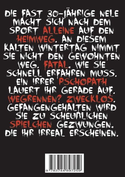 Die fast 30-jährige Nele macht sich nach dem Sport alleine auf den Heimweg. An diesem kalten Wintertag nimmt sie nicht den gewohnten Weg. Fatal, wie sie schnell erfahren muss. Ein irrer Psychopath wird seit geraumer Zeit gesucht und gerade dieser lauert ihr auf. Wegrennen? Zwecklos. Gefangengehalten wird sie zu grotesken Spielchen gezwungen, die ihr irreal erscheinen.