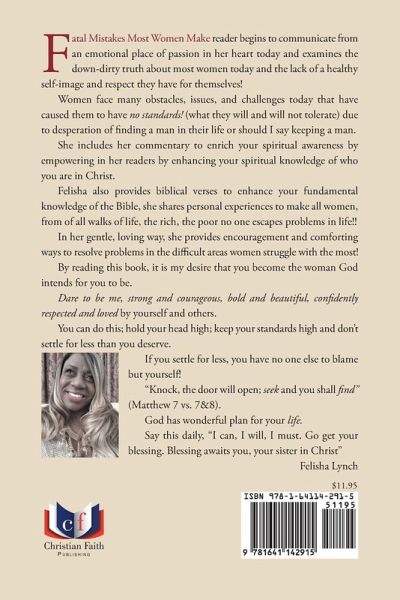Fatal Mistakes Most Women Make reader begins to communicate from an emotional place of passion in her heart today and examines the down-dirty truth about most women today and the lack of a healthy self-image and respect they have for themselves! Women face many obstacles, issues, and challenges today that have caused them to have no standards! (what they will and will not tolerate) due to desperation of finding a man in their life or should I say keeping a man. She includes her commentary to enrich your spiritual awareness by empowering in her readers by enhancing your spiritual knowledge of who you are in Christ. Felisha also provides biblical verses to enhance your fundamental knowledge of the Bible, she shares personal experiences to make all women, from of all walks of life, the rich, the poor no one escapes problems in life!! In her gentle, loving way, she provides encouragement and comforting ways to resolve problems in the difficult areas women struggle with the most! By reading this book, it is my desire that you become the woman God intends for you to be. Dare to be me, strong and courageous, bold and beautiful, confidently respected and loved by yourself and others. You can do this; hold your head high; keep your standards high and don't settle for less than you deserve. If you settle for less, you have no one else to blame but yourself! "Knock, the door will open; seek and you shall find" (Matthew 7 vs. 7and8). God has wonderful plan for your life. Say this daily, "I can, I will, I must. Go get your blessing. Blessing awaits you, your sister in Christ" Felisha Lynch