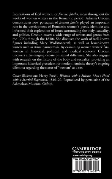 Incarnations of fatal women, or femmes fatales, recur throughout the works of women writers in the Romantic period. Adriana Craciun demonstrates how portrayals of femmes fatales or fatal women played an important role in the development of Romantic women's poetic identities and informed their exploration of issues surrounding the body, sexuality and politics. Craciun covers a wide range of writers and genres from the 1790s through the 1830s. She discusses the work of well-known figures including Mary Wollstonecraft, as well as lesser-known writers like Anne Bannerman. By examining women writers' fatal women in historical, political and medical contexts, Craciun uncovers a far-ranging debate on sexual difference. She also engages with current research on the history of the body and sexuality, providing an important historical precedent for modern feminist theory's ongoing dilemma regarding the status of 'woman' as a sex.