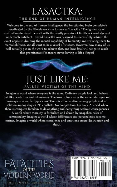 Fatalities of the Modern World: The Complete Collection Lasactka: The End of Human Intelligence Welcome to the end of human intelligence, the functioning brain completely eradicated by the Himalayan virus known as "Lasactka." The ignorance of civilization deceived them all with the deadly promise of limitless knowledge and undeniable intellect. Instead, Lasactka was designed to successfully achieve the exact opposite, draining the mental capability of humanity and reducing them to mental oblivion. We all want to be a vessel of wisdom. However, how many of us will actually put in the work to achieve that, and how fatal will we go to reach that prominence if it means never having to lift a finger? Just Like Me: Fallen Victims of the Mind Imagine a world where everyone is the same. Ordinary people look and behave just like celebrities and influencers. The lower class shares the same privileges and consequences as the upper class. There is no separation among people and no isolation among cliques. No conflicts. No competition. No envy. A world where there is complete freedom to do anything and everything without consequences. A world where morality is forbidden and driven by unspoken rules of commonality. Imagine a world where differences and personalities become extinct. Imagine a world where conscience and emotions create destruction and death.