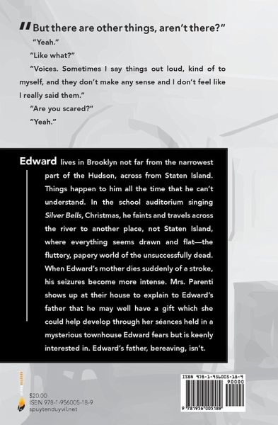 Edward lives in Brooklyn not far from the narrowest part of the Hudson, across from Staten Island. Things happen to him all the time that he can't understand. In the school auditorium singing Silver Bells, Christmas, he faints and travels across the river to another place, not Staten Island, where everything seems drawn and flat-the fluttery, papery world of the unsuccessfully dead. When Edward's mother dies suddenly of a stroke, his seizures become more intense. Mrs. Parenti shows up at their house to explain to Edward's father that he may well have a gift which she could help develop through her séances held in a mysterious townhouse Edward fears but is keenly interested in. Edward's father, bereaving, isn't.