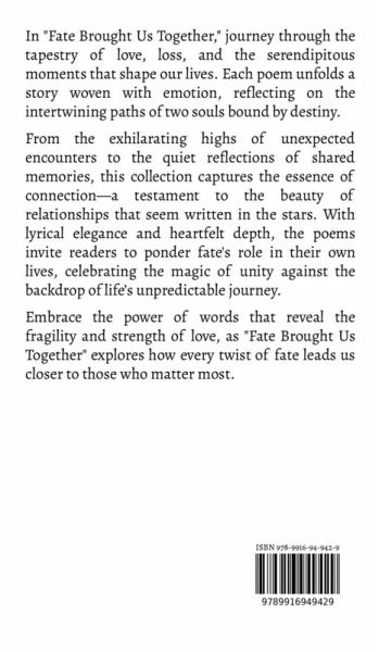 In "Fate Brought Us Together," journey through the tapestry of love, loss, and the serendipitous moments that shape our lives. Each poem unfolds a story woven with emotion, reflecting on the intertwining paths of two souls bound by destiny. From the exhilarating highs of unexpected encounters to the quiet reflections of shared memories, this collection captures the essence of connection-a testament to the beauty of relationships that seem written in the stars. With lyrical elegance and heartfelt depth, the poems invite readers to ponder fate's role in their own lives, celebrating the magic of unity against the backdrop of life's unpredictable journey. Embrace the power of words that reveal the fragility and strength of love, as "Fate Brought Us Together" explores how every twist of fate leads us closer to those who matter most.