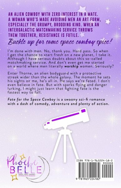 An alien cowboy with zero interest in a mate. A woman who's made avoiding men an art form, especially the grumpy, brooding kind. When an intergalactic matchmaking service throws them together, resistance is futile. I'm done with men. No, thank you. Hard pass. So when I get the chance to start fresh on a new planet, I take it. Although I have serious doubts about this so-called matchmaking service. And don't even get me started on a world where men literally worship women. Seriously? Enter Thorne, an alien bodyguard with a protective streak wider than the whole galaxy. The moment he sets his sights on me, he's all in. He says we're fated. I don't even believe in fate. But with sparks flying and danger lurking, I might just learn that fighting fate is the fastest way to fall. Fate for the Space Cowboy is a swoony sci-fi romance packed with humor, adventure, and plenty of action, in and out of this world.