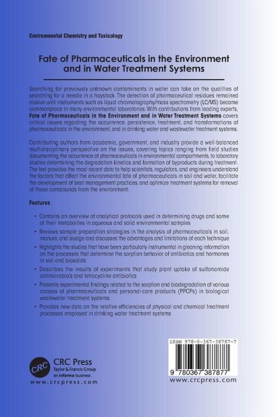 Written by experts from academia, government, and industry, this book provides a well-balanced multi-disciplinary perspective on the issues, discussing topics ranging from field studies documenting the occurrence of pharmaceuticals in environmental compartments, to laboratory studies determining the degradation kinetics and formation of by-products during treatment. The text provides data to help scientists, regulators, and engineers understand the factors that effect the environmental fate of pharmaceuticals in soil and water, facilitate the development of best management practices, and optimize treatment systems for removal of these compounds from the environment.