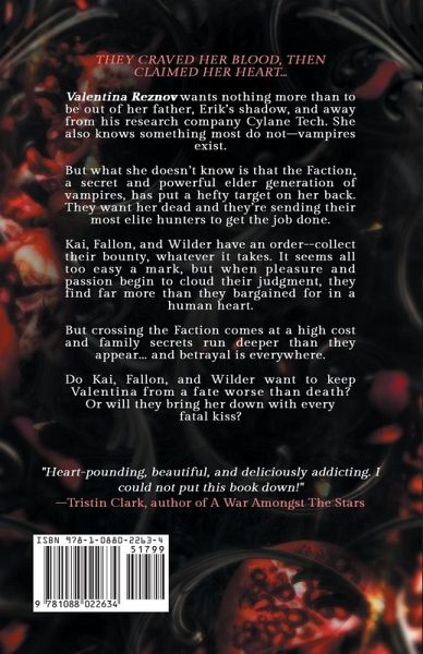 "HEART-POUNDING, BEAUTIFUL, AND DELICIOUSLY ADDICTING. I could not put this book down!"--Tristin Clark, author of A War Amongst The Stars They craved her blood, then claimed her heart... Valentina Reznov wants nothing more than to be out of her father, Erik's shadow, and away from his research company Cylane Tech. She also knows something most do not-vampires exist. But what she doesn't know is that the Faction, a secret and powerful elder generation of vampires, has put a hefty target on her back. They want her dead and they're sending their most elite hunters to get the job done. Kai, Fallon, and Wilder have an order--collect their bounty, whatever it takes. It seems all too easy a mark, but when pleasure and passion begin to cloud their judgment, they find far more than they bargained for in a human heart. But crossing the Faction comes at a high cost and family secrets run deeper than they appear... and betrayal is everywhere. Do Kai, Fallon, and Wilder want to keep Valentina from a fate worse than death? Or will they bring her down with every fatal kiss? This book is intended for readers 18+ and Content Warnings will be provided in front of the book.