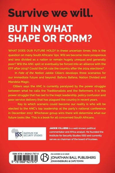 What does our future hold? Will the ANC split within the next five years? Could the DA rule the country in 2024? Will the EFF form an alliance with the ANC? What should we do to make our economy grow at levels that will impact on poverty and inequality? Will we become a more tolerant or a more violent society? In Fate of the Nation scenario expert Jakkie Cilliers answers all these and many other questions. He has developed three detailed scenarios for our immediate future and beyond – Bafana Bafana, Nation Divided and Mandela Magic. According to Cilliers the ANC is in many ways paralysed by the power struggle between what he calls the Traditionalists (supporters of Jacob Zuma) and the Reformers (led by Cyril Ramaphosa and others). This power struggle leads to policy confusion, poor leadership and general ineptitude in the civil service. Key to which scenario will become our reality is who will be elected to the ANC’s top leadership at their national conference in December 2017. Whichever group wins will determine what our future holds. We could also see a compromise grouping being selected, Cilliers says, in which case the Bafana Bafana scenario – where we simply muddle along as a country – is the strongest possibility. A book for all concerned South Africans.
