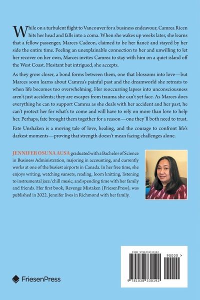 While on a turbulent flight to Vancouver for a business endeavour, Camrea Ricen hits her head and falls into a coma. When she wakes up weeks later, she learns that a fellow passenger, Marces Cadeon, claimed to be her fiancé and stayed by her side the entire time. Feeling an unexplainable connection to her and unwilling to let her recover on her own, Marces invites Camrea to stay with him on a quiet island off the West Coast. Hesitant but intrigued, she accepts. As they grow closer, a bond forms between them, one that blossoms into love-but Marces soon learns about Camrea's painful past and the dreamworld she retreats to when life becomes too overwhelming. Her reoccurring lapses into unconsciousness aren't just accidents; they are escapes from trauma she can't yet face. As Marces does everything he can to support Camrea as she deals with her accident and her past, he can't protect her for what's to come and will have to rely on more than love to help her. Perhaps, fate brought them together for a reason-one they'll both need to trust. Fate Unshaken is a moving tale of love, healing, and the courage to confront life's darkest moments-proving that strength doesn't mean facing challenges alone.
