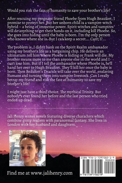 Would you risk the fate of humanity to save your brother's life? After rescuing my pregnant friend Phoebe from Hugh Beaufort, I promise to protect her. But her unborn child is a vampire-witch hybrid - a being of immense power. Spirit witches and vampires will do anything to get their hands on it, including kill Phoebe. So, she goes into hiding until the baby is born. I'm the only person who knows where she is. But I can keep a secret.... Can't I?... The problem is, I didn't bank on the Spirit Realm ambassador using my brother's life as a bargaining chip. He delivers an ultimatum: tell him where Phoebe is hiding or Frank will die. My brother means more to me than anyone else in the world and I can't lose him. But if I tell the ambassador where Phoebe is, he'll hand her over to Hugh Beaufort. They'll kill her once the baby is born. Then Beaufort's Draculs will take over the world, enslaving humans and turning them into vampire livestock. Can I really betray my friend and risk the fate of humanity to save my brother's life? I might just have a third choice. The mythical Trinity. But nobody's ever found her before and the last person who tried ended up dead. For fans of Annette Marie, Linsey Hall, Patricia Briggs and Ilona Andrews. If you love sassy heroines, villains you love to hate and unputdownable chapters, you'll love this fast-paced urban fantasy book. Content: Contains language and violence.