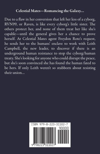 Celestial Mates-Romancing the Galaxy... Due to a flaw in her conversion that left her less of a cyborg, RVN99, or Raven, is like every cyborg's little sister. The others protect her, and none of them treat her like she's capable-until the general gives her a chance to prove herself. At Celestial Mates agent Freydon Rote's request, he sends her to the humans' enclave to work with Leith Campbell, the new leader, to discover if there is an underground human resistance to stop the cyborg/human treaty. She's looking for anyone who could disrupt the peace, but she's soon convinced she has found the human fated to be hers. If only Leith weren't so stubborn about resisting their union... Can a love fated outside of time and space conquer his resistance and bring them the healing and acceptance they both need? Find out in this latest installment in the Celestial Mates (and Cybernetic Hearts) series, brought to you by USA Today bestselling author Kit Tunstall, writing as Aurelia Skye. This story can be read as a standalone, but the overall story arc is strengthened by reading each in order.