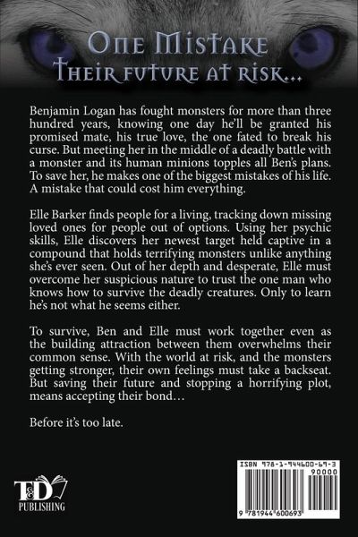 Will one mistake destroy their future... Benjamin Logan has fought monsters for more than three hundred years, knowing one day he'll be granted his promised mate, his true love, the one fated to break his curse. But meeting her in the middle of a deadly battle with a monster and its human minions topples all Ben's plans. To save her, he makes one of the biggest mistakes of his life. A mistake that could cost him everything. Elle Barker finds people for a living, tracking down missing loved ones for people out of options. Using her psychic skills, Elle discovers her newest target held captive in a compound that holds terrifying monsters unlike anything she's ever seen. Out of her depth and desperate, Elle must overcome her suspicious nature to trust the one man who knows how to survive the deadly creatures. Only to learn he's not what he seems either. To survive, Ben and Elle must work together even as the building attraction between them overwhelms their common sense. With the world at risk, and the monsters getting stronger, their own feelings must take a backseat. But saving their future and stopping a horrifying plot, means accepting their bond... Before it's too late.