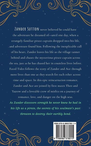 Zander Sutton never believed he could have the adventure he dreamed of-until one day, when a strangely familiar pirate captain dropped into his life, and adventure found him. Following the inexplicable call of his heart, Zander leaves his life as the village tanner behind and chases the mysterious pirate captain across the sea, just as he has chased her in countless lives before. Fated Tides follows the story of Zander and Ace through more lives than one as they search for each other across time and space. In this epic reincarnation romance, Zander and Ace are joined by first mates Theo and Yarrow and a loveable crew of misfits on a journey of romance, love, and danger on the high seas. As Zander discovers strength he never knew he had in his life as a pirate, the secrets of his soulmate's past threaten to destroy their earthly bond. Fated Tides is the second installment in the Metaphysical Love Stories series, a series of reincarnation romance novels with interconnected storylines that can each be read as standalone novels.