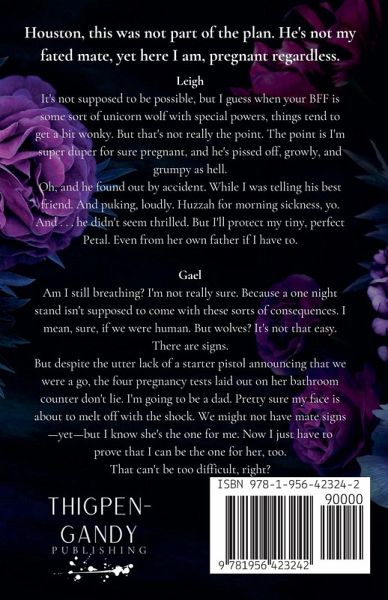 Houston, this was not part of the plan. Not even a little tiny bit. He's not my fated mate, yet here I am, pregnant regardless. Leigh It's not supposed to be possible, but I guess when your BFF is some sort of unicorn wolf with special powers, things tend to get a bit wonky. But that's not really the point. The point is I'm super duper for sure pregnant, and he's pissed off, growly, and grumpy as hell. Oh, and he found out by accident. While I was telling his best friend. And puking, loudly. Huzzah for morning sickness, yo. And . . . he didn't seem thrilled. Not loving the trajectory, here. But I'll protect my tiny, perfect Petal. Even from her own father if I have to. Gael Am I still breathing? I'm not really sure. Because a one night stand isn't supposed to come with these sorts of consequences. I mean, sure, if we were human. But wolves? It's not that easy. There are signs. But despite the utter lack of a starter pistol announcing that we were a go, the four pregnancy tests laid out on her bathroom counter don't lie. I'm going to be a dad. Pretty sure my face is about to melt off with the shock. She and I are like oil and water. Fire and gasoline? Yeah, that one. It's not because I don't like her. Hell, I can't stop thinking about her. The problem is she knows how to push every last one of my buttons, and she's determined to slam the door in my face. But I'm not the kind of guy to take no for an answer, not when the woman I'm crazy about and my baby are on the line. We might not have mate signs-yet-but I know she's the one for me. Now I just have to prove that I can be the one for her, too. That can't be too difficult, right?