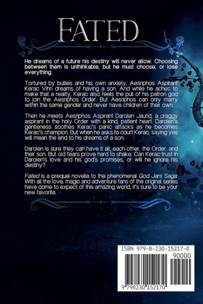 He dreams of a future his destiny will never allow. Choosing between them is unthinkable, but he must choose, or lose everything. Tortured by bullies and his own anxiety, Aesriphos Aspirant Kerac Vihn dreams of having a son. And while he aches to make that a reality, Kerac also feels the pull of his patron god to join the Aesriphos Order. But Aesriphos can only marry within the same gender and never have children of their own. Then he meets Aesriphos Aspirant Darolen Jaund, a craggy aspirant in the holy Order with a kind, patient heart. Darolen's gentleness soothes Kerac's panic attacks as he becomes Kerac's champion. But when he asks to court Kerac, saying yes will mean the end to his dreams of a son. Darolen is sure they can have it all: each other, the Order, and their son. But old fears prove hard to shake. Can Kerac trust in Darolen's love and his god's promises, or will he ignore his destiny? Fated is a prequel novella to the phenomenal God Jars Saga. With all the love, magic, and adventure fans of the original series have come to expect of this amazing world, it's sure to be your new favorite. Fun Facts: Fated mates is my jam; mages and warriors train in a militaristic magic school; social anxiety, depression, and PTSD are real, and symptoms are found in every book; found family gets physical when they meet a touch-starved, feral Valis; idiots learn how to help Kerac when he has a panic attack; Darolen puts the fear of the gods into his a**hole friends ... and threatens to make a friend swallow his sword-he is not amused; protective x11; Kerac is a sweet doll baby with a crush; Darolen gets tired of chasing and surprise kisses Kerac; Kerac can't get enough of them kisses; adorable schmoop.