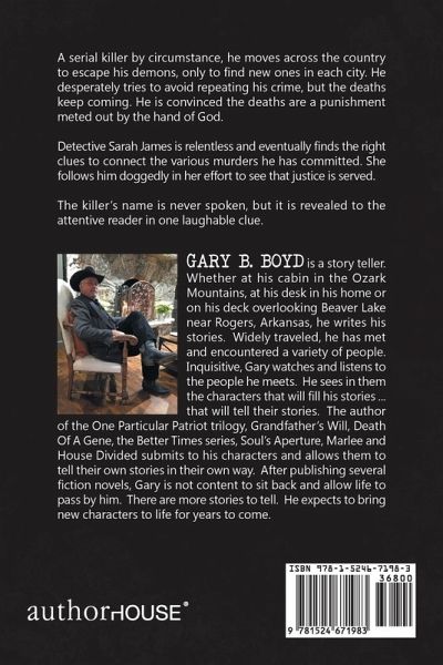A serial killer by circumstance, he moves across the country to escape his demons, only to find new ones in each city. He desperately tries to avoid repeating his crime, but the deaths keep coming. He is convinced the deaths are a punishment meted out by the hand of God. Detective Sarah James is relentless and eventually finds the right clues to connect the various murders he has committed. She follows him doggedly in her effort to see that justice is served. The killer’s name is never spoken, but it is revealed to the attentive reader in one laughable clue.