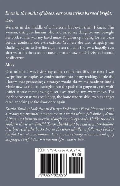 Even in the midst of chaos, our connection burned bright. Rafe We met in the middle of a firestorm but even then, I knew. This woman, this pure human who had saved my daughter and brought her back to me, was my fated mate. I'd given up hoping for her years before, doubting she even existed. Yet here she was, tempting me, challenging me to live life again, even though I knew a happily ever after wasn't in the cards for me, no matter how much I wished it could be different. Abby One minute I was living my calm, drama-free life, the next I was swept into an explosive confrontation not of my making. Little did I know that protecting a stranger would throw me headfirst into a whole new world, and straight into the path of a gorgeous, rare wolf-shifter whose mesmerizing silver eyes tracked my every move. The spark between us was soul-deep, the bond undeniable, even as danger came knocking at the door once again. Fateful Touch is book four in Kristyn DeMaster's Fated Moments series, a steamy paranormal romance set in a world where full shifters, demi-shifters, and humans co-exist, though not always easily. Fateful Touch is best read after books 1-3 in the series ideally, or following book 3, Fateful Lies, at a minimum. Due to some steamy situations and spicy language, Fateful Touch is intended for readers 18+.