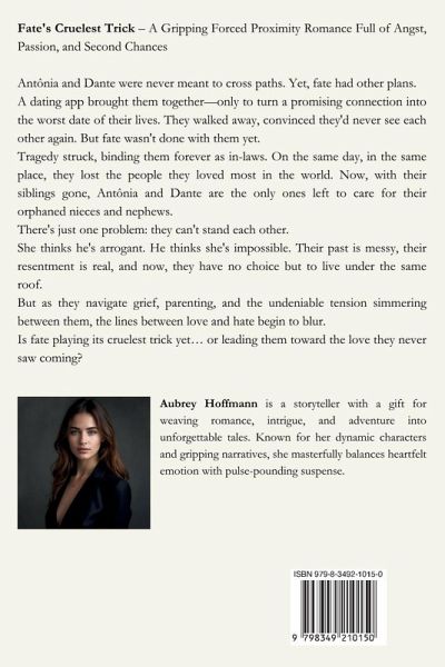 Fate's Cruelest Trick - A Gripping Forced Proximity Romance Full of Angst, Passion, and Second Chances Antônia and Dante were never meant to cross paths. Yet, fate had other plans. A dating app brought them together-only to turn a promising connection into the worst date of their lives. They walked away, convinced they'd never see each other again. But fate wasn't done with them yet. Tragedy struck, binding them forever as in-laws. On the same day, in the same place, they lost the people they loved most in the world. Now, with their siblings gone, Antônia and Dante are the only ones left to care for their orphaned nieces and nephews. There's just one problem: they can't stand each other. She thinks he's arrogant. He thinks she's impossible. Their past is messy, their resentment is real, and now, they have no choice but to live under the same roof. But as they navigate grief, parenting, and the undeniable tension simmering between them, the lines between love and hate begin to blur. Is fate playing its cruelest trick yet... or leading them toward the love they never saw coming?