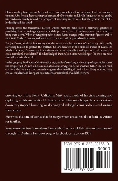 Once a wealthy businessman, Mathen Cutter has remade himself as the defiant leader of a refugee caravan. After fleeing the escalating war between the Necromian and Elvish Kingdoms, he has guided his patchwork family toward the prospect of sanctuary in the east. But the greatest test of his leadership still lies ahead. Pushing across the treacherous Eastern Wastes, Mathen's band faces a harrowing gauntlet of punishing elements, unforgiving terrain, and the perpetual threat of shadowy pursuers determined to bring them down. When a young pickpocket named Remy emerges with a warning of greater evil on their trail, Mathen's courage and his caravan's resilience will be pushed to their limits. For Jas Cutter, Mathen's headstrong son, the journey has become one of awakening. After rashly sacrificing himself to protect the children, he lays bereaved in the ominous Forest of Death. As Mathen races to Jas's rescue, ancient whispers stir in the injured boy - whispers of a dark power that could unmake the world itself. The shackled god Destiny's ominous words linger: "Yours is the hand that will unmake the world." In this gripping third book of the Fate's Foe saga, a tale of remaking and coming-of-age unfolds across the refugee trail. As new allies and old adversaries emerge from the shadows, father and son must confront whether their bond can endure against the unraveling of destiny itself. Every sacrifice, every choice, could remake their path to sanctuary...or unmake the world they know.