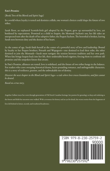 Fate's Promise (Book Two of the Blood and Spirit Saga) In a world where loyalty is tested and destinies collide, one woman's choices could shape the future of two tribes. Sarah Root, an orphaned Scottish-Irish girl adopted by the Pequot, grew up surrounded by love, yet burdened by expectations. Promised as a child to Sequin, the Montauk sachem's son, her life takes an unexpected turn after the death of her adoptive father, the Pequot sachem. The betrothal is broken, leaving Sarah torn between duty and the desires of her heart. As she comes of age, Sarah finds herself at the center of a powerful story of love and leadership. Bound by loyalty to her Pequot brothers, Petoath and Wopegeoit-one destined to lead their tribe, the other destined to join the Montauk-Sarah must navigate the tension between tradition and her own path. When fate brings Sequin back into her life, their undeniable bond reignites, forcing them to confront old promises and the unspoken future that awaits. In Fate's Promise, alliances are tested, love is redefined, and the future of two tribes hangs in the balance. For readers who crave sweeping historical drama, heart-pounding romance, and unforgettable characters, this is a story of resilience, passion, and the unbreakable ties of destiny. Discover the next chapter in the Blood and Spirit Saga-a tale where love crosses boundaries, and fate cannot be denied. Based on a true story.