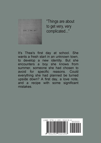 It's Thea's first day at school. She wants a fresh start in an unknown town, to develop a new identity. But she encounters a boy she knows from summer, someone she had chosen to avoid for specific reasons. Could everything she had planned be turned upside down? A first day, a love note, and a recipe with some significant mistakes.