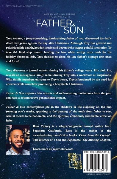 Some say family is everything. Some say family are just people we're assigned to at birth. ¿Trey Amana, a forty-something, hardworking father of two, discovered his dad's death five years ago on the day after Christmas. Although Trey has grieved and prioritized his health, holiday music and decorations trigger painful memories. To take the final step toward healing the loss while saving extra cash for his holiday-obsessed kids, Trey decides to close his late father's storage unit once and for all. Trey discovers a journal written during his father's college years. His dad, Art, reveals an outrageous family secret driving Trey into a wormhole of suspicions. With family members en-route to Trey's home, Trey is burdened by the need for answers while somehow producing a hospitable Christmas. Father & Sun explores how secrets and well-meaning motivations from the past can have a counteractive generational impact. Father & Sun contemplates life in the shadows or life standing on the Sun (owning one's truth), speaking to the passing of the torch from father to son, what it means to be honorable, and the spiritual, emotional, and mental effect on heirs.