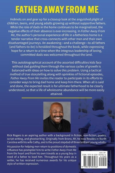 Rick Rogers is an aspiring author with a background in fiction, nonfiction, poetry, script writing, and ghostwriting. Originally from Bronx, NY, he now resides in Charlotte, North Carolina with his wife Cathy, and is the proud stepdad of three brilliant young adults. His passion for helping men return to positions of domestic influence has prompted him to write Father Away From Me from the heart and from his own travails as a young boy in need of a father to lead him. Throughout his years as a writer, he has received numerous awards for his unique style of written expression.