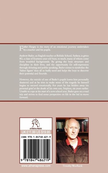 Father Hungry is the story of an emotional journey undertaken by a teacher and his pupils. Andrew Bader, an English teacher at Beldale School, Sydney, is given 8G, a class of fourteen-year-old boys, to teach, many of whom come from troubled backgrounds. By giving the boys structure and discipline in their lives, and the opportunity for self-expression through debating and public speaking, Bader comes to symbolise the 'father figure' they all so badly need and helps the boys to discover their potential and flourish. However, the suicide of one of Bader's pupils leaves him personally shattered and as he tries to make sense of the tragedy he himself begins to unravel emotionally. For years he has hidden away his personal grief at the death of his own son, Stephen, six years earlier. Unable to cope at the start of a new school year, Bader goes on a road trip and strives to find some perspective on life in the bid to move forward.