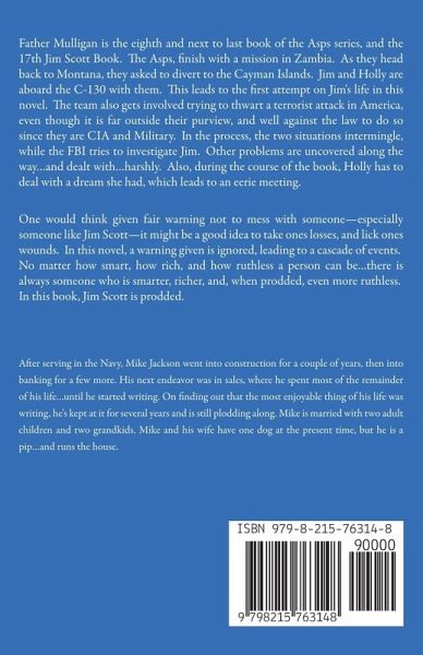 Father Mulligan is the eighth and next to last book of the Asps series, and the 17th Jim Scott Book. The Asps, finish with a mission in Zambia. As they head back to Montana, they asked to divert to the Cayman Islands. Jim and Holly are aboard the C-130 with them. This leads to the first attempt on Jim's life in this novel. The team also gets involved trying to thwart a terrorist attack in America, even though it is far outside their purview, and well against the law to do so since they are CIA and Military. In the process, the two situations intermingle, while the FBI tries to investigate Jim. Other problems are uncovered along the way…and dealt with…harshly. Also, during the course of the book, Holly has to deal with a dream she had, which leads to an eerie meeting. One would think given fair warning not to mess with someone-especially someone like Jim Scott-it might be a good idea to take ones losses, and lick ones wounds. In this novel, a warning given is ignored, leading to a cascade of events. No matter how smart, how rich, and how ruthless a person can be…there is always someone who is smarter, richer, and, when prodded, even more ruthless. In this book, Jim Scott is prodded.