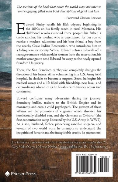 Edward Finlay recalls his life's odyssey beginning in the 1890s on his family ranch in rural Montana. His childhood revolves around three people: his father, a cattle rancher; his mother, who is determined for her son to receive a modern education; and his best friend, a boy from the nearby Crow Indian Reservation, who introduces him to a fading warrior society. When Edward refuses to break off a teenage romance with an older woman from the reservation, his mother arranges to send Edward far away to the newly opened Stanford University. There, the San Francisco earthquake completely changes the direction of his future. After volunteering in a U.S. Army field hospital, he decides to become a surgeon. Soon, he begins his medical career and a life filled with friendship, new love, and extraordinary adventure as he brushes with history across two continents. Edward confronts many adversaries during his journey: dormitory bullies, traitors to the British Empire and its monarchy, and even a child psychopath. The greatest of these villains are the promoters of eugenics, which threaten his intellectually disabled son, and the Germans at Orhdruf (the first concentration camp liberated by the U.S. Army in WW2). As a son, husband, father, pioneering vascular surgeon, and veteran of two world wars, he attempts to understand the inequities of fortune and the inexplicable cruelty he encounters.