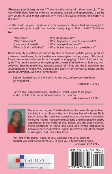 "Because she listens to me." These are the words of a three-year-old. Their way of exhibiting feelings of being respected, valued, and appreciated. Can the very young in your midst express why they are always excited and happy to see you? Do the youth in your family or in your presence always feel encouraged to converse with you or ask the questions weighing on their minds? Questions like: - Who am I? - Who formed me? - How was I formed? - Who is God the Father? - Why do people die? - What happens to people after death? - What are spirit and soul? - What is the reason for my existence? These weighty questions, prompted by God in the minds of the young, produce a pleasant awakening from the divine answers given in the pages of this book. A new awareness emerges from the spiritual engaging of the mind, soul, and spirit. This results in new and inspiring discoveries that lead to confidence, truth believing, healthy reasoning, respect, peace of mind, and the knowledge and understanding of God's will, purpose, and destiny for the young. These are the Words of Almighty God the Father to all: Before I formed you in the womb I knew you, before you were born I set you apart... -Jeremiah 1:5 NIV For we are God's handiwork, created in Christ Jesus to do good works, which God prepared in advance for us to do. -Ephesians 2:10 NIV