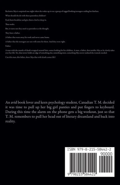 Reclusive Mya is surprised one night when she wakes up to see a group of ragged looking teenagers raiding her kitchen. What should she do with these parentless children? Feed them breakfast and give them a bed to sleep in. That works. But, it turns out they aren't as parentless as she thought. They have a father. A father that went away for work and never came home. A father that the teenagers are sure will come for them. And they were right. Father. A man with the mantle of death wrapped around him, comes looking for his children. A man, a father, that terrifies Mya as he slowly takes over her life. Yet, that terror holds an edge of something else, something more, something Mya never realized she wanted, needed. Can this man, this father, show Mya that with death comes life?