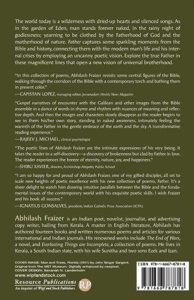 The world today is a wilderness with dried-up hearts and silenced songs. As in the garden of Eden, man stands forever naked, in the rainy night of godlessness; yearning to be clothed by the Fatherhood of God and the motherhood of nature. Father captures some sparkling moments from the Bible and history, connecting them with the modern man's life and his internal crises by employing an uncanny poetic vision. Explore the true Father in these magnificent lines that open a new vision of universal brotherhood.