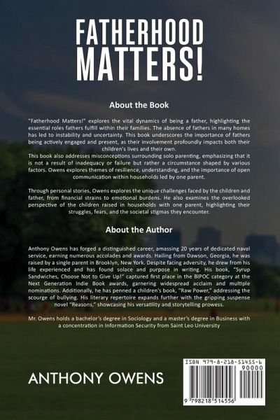 Fatherhood Matters! is a powerful exploration of the vital role fathers play in shaping the well-being and development of their families. With a deep dive into the emotional, psychological, and practical aspects of fatherhood, this book highlights the irreplaceable influence of fathers in creating stable and nurturing environments for their children. It argues that the active presence of fathers can significantly reduce feelings of instability and uncertainty within the family unit. Through personal anecdotes, research, and expert insights, the book illustrates how a father's involvement not only enriches the lives of his children but also enhances his own sense of purpose and fulfillment. The book also tackles the often-overlooked issue of father absence and its broader societal consequences. It examines how many homes today suffer from a lack of paternal engagement, resulting in increased challenges for children as they grow up without the crucial guidance and support fathers typically provide. Yet, Fatherhood Matters! is not just about traditional two-parent households; it also sheds light on the dynamics of solo parenting, debunking myths that surround single fathers and mothers. Author Owens emphasizes that solo parenting is not a reflection of personal failure but rather the outcome of various social, economic, and personal factors that influence family structures. Throughout the book, Owens stresses the importance of resilience, adaptability, and open communication in navigating the challenges of modern fatherhood. Whether discussing the complexities of co-parenting, the role of fathers in emotional development, or the need to redefine what it means to be a father in today's world, Fatherhood Matters! serves as a comprehensive guide for fathers looking to build deeper connections with their children and create lasting positive impacts within their families. This book is a call to action for men to embrace fatherhood with commitment and compassion, recognizing that their role is critical in shaping the next generation. Through practical advice, heartfelt stories, and a genuine understanding of the struggles many fathers face, Owens provides a roadmap for fathers to thrive, even in difficult circumstances. In essence, Fatherhood Matters! is not just about being present; it's about being purposefully involved in the lives of those who matter most-your children.