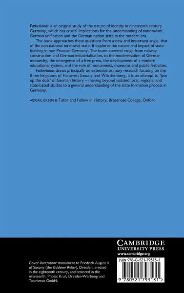 Fatherlands is an original study of the nature of identity in nineteenth-century Germany, which has crucial implications for the understanding of nationalism, German unification and the German nation state in the modern era. The book approaches these questions from a new and important angle, that of the non-national territorial state. It explores the nature and impact of state-building in non-Prussian Germany. The issues covered range from railway construction and German industrialisation, to the modernisation of German monarchy, the emergence of a free press, the development of a modern educational system, and the role of monuments, museums and public festivities. Fatherlands draws principally on extensive primary research focusing on the three kingdoms of Hanover, Saxony and Württemberg. It is an attempt to 'join up the dots' of German history - moving beyond isolated local, regional and state-based studies to a general understanding of the state formation process in Germany.