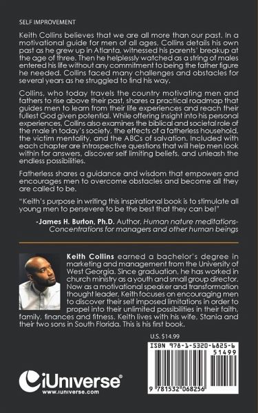 Keith Collins believes that we are all more than our past. In a motivational guide for men of all ages, Collins details his own past as he grew up in Atlanta, witnessed his parents' breakup at the age of three. Then he helplessly watched as a string of males entered his life without any commitment to being the father figure he needed. Collins faced many challenges and obstacles for several years as he struggled to find his way. Collins, who today travels the country motivating men and fathers to rise above their past, shares a practical roadmap that guides men to learn from their life experiences and reach their fullest God given potential. While offering insight into his personal experiences, Collins also examines the biblical and societal role of the male in today's society, the effects of a fatherless household, the victim mentality, and the ABCs of salvation. Included with each chapter are introspective questions that will help men look within for answers, discover self limiting beliefs, and unleash the endless possibilities. Fatherless shares a guidance and wisdom that empowers and encourages men to overcome obstacles and become all they are called to be. "Keith's purpose in writing this inspirational book is to stimulate all young men to persevere to be the best that they can be!" -James H. Burton, Ph.D. Author, Human nature meditations-Concentrations for managers and other human beings