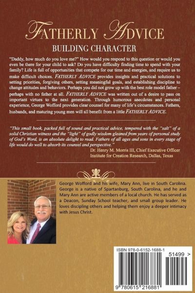 "Daddy, how much do you love me?" How would you respond to this question or would you even be there for your child to ask? Do you have difficulty finding time to spend with your family? Life is full of opportunities that compete for our time and energies, and require us to make difficult choices. FATHERLY ADVICE provides insights and practical solutions to setting priorities, forgiving others, setting meaningful goals, and establishing discipline to change attitudes and actions. Perhaps you did not grow up with the best role model father - perhaps with no father at all. FATHERLY ADVICE was written out of a desire to pass on important virtues to the next generation. Through humorous anecdotes and personal experience, George Wofford provides clear counsel for many of life's circumstances. Fathers, husbands, and maturing young men will all benefit from a little FATHERLY ADVICE.