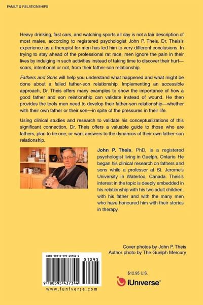 Heavy drinking, fast cars, and watching sports all day is not a fair description of most males, according to registered psychologist John P. Theis. Dr. Theis's experience as a therapist for men has led him to very different conclusions. In trying to stay ahead of the professional rat race, men ignore the pain in their lives by indulging in such activities instead of taking time to discover their hurt-scars, intentional or not, from their father-son relationship. Fathers and Sons will help you understand what happened and what might be done about a failed father-son relationship. Implementing an accessible approach, Dr. Theis offers many examples to show the importance of how a good father and son relationship can validate instead of wound. He then provides the tools men need to develop their father-son relationship-whether with their own father or their son-in spite of the pressures in their life. Using clinical studies and research to validate his conceptualizations of this significant connection, Dr. Theis offers a valuable guide to those who are fathers, plan to be one, or want answers to the dynamics of their own father-son relationship.