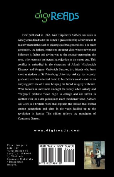 First published in 1862, Ivan Turgenev's "Fathers and Sons" is widely considered to be the author's greatest literary achievement. It is a novel about the clash of ideologies of two generations. The older generation, the fathers, represents an upper class whose power and influence is fading and giving way to the younger generation, the sons, who represent an increasing objection to the status quo. This conflict is embodied in the characters of Arkady Nikolaevich Kirsanov and Yevgeny Vasilevich Bazarov, two friends who have meet as students at St. Petersburg University. Arkady has recently graduated and has returned home to his father's small estate in an outlying province of Russia bringing his friend Yevgeny with him. What follows is uneasiness amongst the family when Arkady and Yevgeny's nihilistic views begin to emerge and are shown in conflict with the older generations more traditional views. "Fathers and Sons" is a brilliant work that captures the tension that existed among generations and class in the years leading up to the revolution in Russia. This edition is printed on premium acid-free paper and follows the translation of Constance Garnett.
