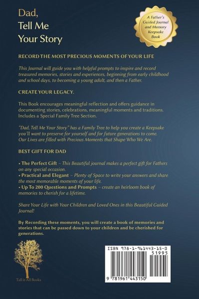 Record The Most Precious Moments Of Your Life This Journal will guide you with helpful prompts to inspire and record treasured memories, stories and experiences, beginning from early childhood and school days, to becoming a young adult, and then a Father. Create Your Legacy. This Book encourages meaningful reflection and offers guidance in documenting stories, celebrations, meaningful moments and traditions. Includes a Special Family Tree Section. "Dad, Tell Me Your Story" has a Family Tree to help you create a Keepsake you'll want to preserve for yourself and for future generations to come. Our Lives are filled with Precious Moments that Shape Who We Are. BEST GIFT FOR DAD ¿ The Perfect Gift - This Beautiful journal makes a perfect gift for Fathers on any special occasion. ¿ Practical and Elegant - Plenty of Space to write your answers and share the most memorable moments of your life. ¿ Up To 200 Questions and Prompts - create an heirloom book of memories to cherish for a lifetime. Share Your Life with Your Children and Loved Ones in this Beautiful Guided Journal! By Recording these moments, you will create a book of memories and stories that can be passed down to your children and be cherished for generations.
