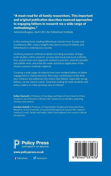 Introduction ~ Esther Dermott and Caroline Gatrell; Framing fatherhood: the ethics and philosophy of researching fatherhoods ~ Jonathan Ives; Qualitative longitudinal research: researching fatherhood and fathers' experiences ~ Tina Miller; Researching fathers through surveys: methodological challenges ~ Maria Letizia Bosoni and Sara Mazzucchelli; Fatherhood research on the internet: methodological reflections from a literature review ~ Lars Plantin and Kristian Daneback; Researching fatherhood and place: adopting an ethnographic approach ~ Therése Wissö; Teleconference focus groups with fathers: 'You're on the line with...' ~ Simon Burnett and Caroline Gatrell; Using visual technologies: young children's perspectives on fathers ~ Susan Milner and Rita Chawla-Duggan; Interviewing young fathers: managing ethical risks ~ Carmen Lau-Clayton; Engaging fathers with family support services: using conversation analysis ~ Jon Symonds; Mixing methods in fatherhood research: studying social change in family life ~ Allan Westerling; Capturing the bigger picture with big data: opportunities for fatherhood researchers ~ Esther Dermott.