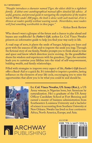 Who doesn't want a glimpse of the future and a chance to plan ahead and bypass any roadblocks? In Father's Gift, author Lt. Col. Vince Nwafor presents an informative guide to help you find your way early in life. A road map of sorts, it plants the seeds of hunger, helping you learn and grow with the seasons of life and to improve the seeds you reap. Through the fictional story of one family, Nwafor prompts you to think ahead in time and space and know which direction you're moving. As the grandfather shares his wisdom and experiences with his grandson, Tiger, the narrative leads you to untwine your lifeline into the triad of self-empowerment, building wealth, and family relationships. Filled with strategies to improve every aspect of life, Father's Gift doesn't offer a Band-Aid or a quick fix. It's intended to imprint a positive, lasting influence on the elements of your life cycle, encouraging you to seize the opportunities that allow you to be what you could be and should be.