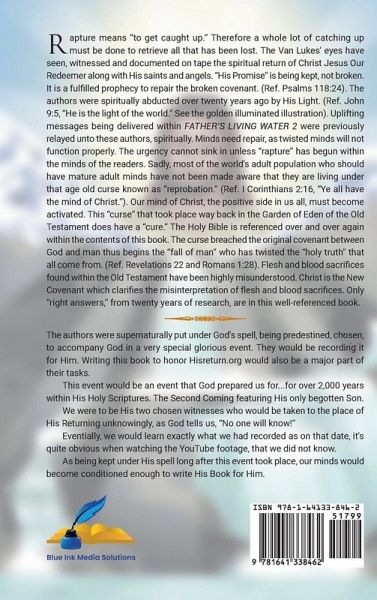 Rapture means "to get caught up." Therefore a whole lot of catching up must be done to retrieve all that has been lost. The Van Lukes' eyes have seen, witnessed and documented on tape the spiritual return of Christ Jesus Our Redeemer along with His saints and angels. "His Promise" is being kept, not broken. It is a fulfilled prophecy to repair the broken covenant. (Ref. Psalms 118:24). The authors were spiritually abducted over twenty years ago by His Light. (Ref. John 9:5, "He is the light of the world." See the golden illuminated illustration). Uplifting messages being delivered within FATHER'S LIVING WATER 2 were previously relayed unto these authors, spiritually. Minds need repair, as twisted minds will not function properly. The urgency cannot sink in unless "rapture" has begun within the minds of the readers. Sadly, most of the world's adult population who should have mature adult minds have not been made aware that they are living under that age old curse known as "reprobation." (Ref. I Corinthians 2:16, "Ye all have the mind of Christ."). Our mind of Christ, the positive side in us all, must become activated. This "curse" that took place way back in the Garden of Eden of the Old Testament does have a "cure." The Holy Bible is referenced over and over again within the contents of this book. The curse breached the original covenant between God and man thus begins the "fall of man" who has twisted the "holy truth" that all come from. (Ref. Revelations 22 and Romans 1:28). Flesh and blood sacrifices found within the Old Testament have been highly misunderstood. Christ is the New Covenant which clarifies the misinterpretation of flesh and blood sacrifices. Only "right answers," from twenty years of research, are in this well-referenced book.