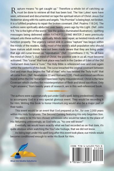 Rapture means "to get caught up." Therefore a whole lot of catching up must be done to retrieve all that has been lost. The Van Lukes' eyes have seen, witnessed and documented on tape the spiritual return of Christ Jesus Our Redeemer along with His saints and angels. "His Promise" is being kept, not broken. It is a fulfilled prophecy to repair the broken covenant. (Ref. Psalms 118:24). The authors were spiritually abducted over twenty years ago by His Light. (Ref. John 9:5, "He is the light of the world." See the golden illuminated illustration). Uplifting messages being delivered within FATHER'S LIVING WATER 2 were previously relayed unto these authors, spiritually. Minds need repair, as twisted minds will not function properly. The urgency cannot sink in unless "rapture" has begun within the minds of the readers. Sadly, most of the world's adult population who should have mature adult minds have not been made aware that they are living under that age old curse known as "reprobation." (Ref. I Corinthians 2:16, "Ye all have the mind of Christ."). Our mind of Christ, the positive side in us all, must become activated. This "curse" that took place way back in the Garden of Eden of the Old Testament does have a "cure." The Holy Bible is referenced over and over again within the contents of this book. The curse breached the original covenant between God and man thus begins the "fall of man" who has twisted the "holy truth" that all come from. (Ref. Revelations 22 and Romans 1:28). Flesh and blood sacrifices found within the Old Testament have been highly misunderstood. Christ is the New Covenant which clarifies the misinterpretation of flesh and blood sacrifices. Only "right answers," from twenty years of research, are in this well-referenced book.