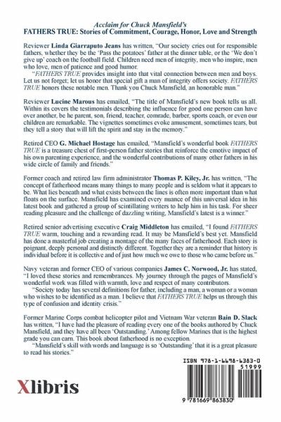 When the author's son John suggested he write a book about fatherhood, he thought, with all the books on fatherhood, who needs another? He concluded, "Perhaps I do." While the book is indeed about fatherhood and fathers, it also tells of other fitting paternal exemplars - father figures - who may not have had children of their own but nonetheless have or had the right stuff as men and mentors. A central tenet herein is that good strong fathers are essential to the character building and moral fiber of our young and the very fabric and future of our currently downward-spiraling society. One reviewer writes, "...the testimonials describing the influence for good one person can have over another, be he parent, son, friend, teacher, comrade, barber, sports coach, or even our children are remarkable. The vignettes sometimes evoke amusement, sometimes tears, but lift the spirit and stay in the memory."